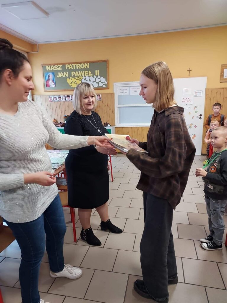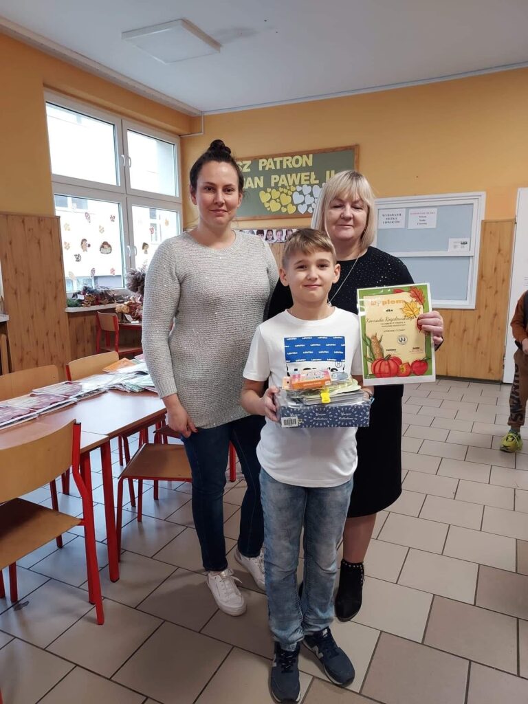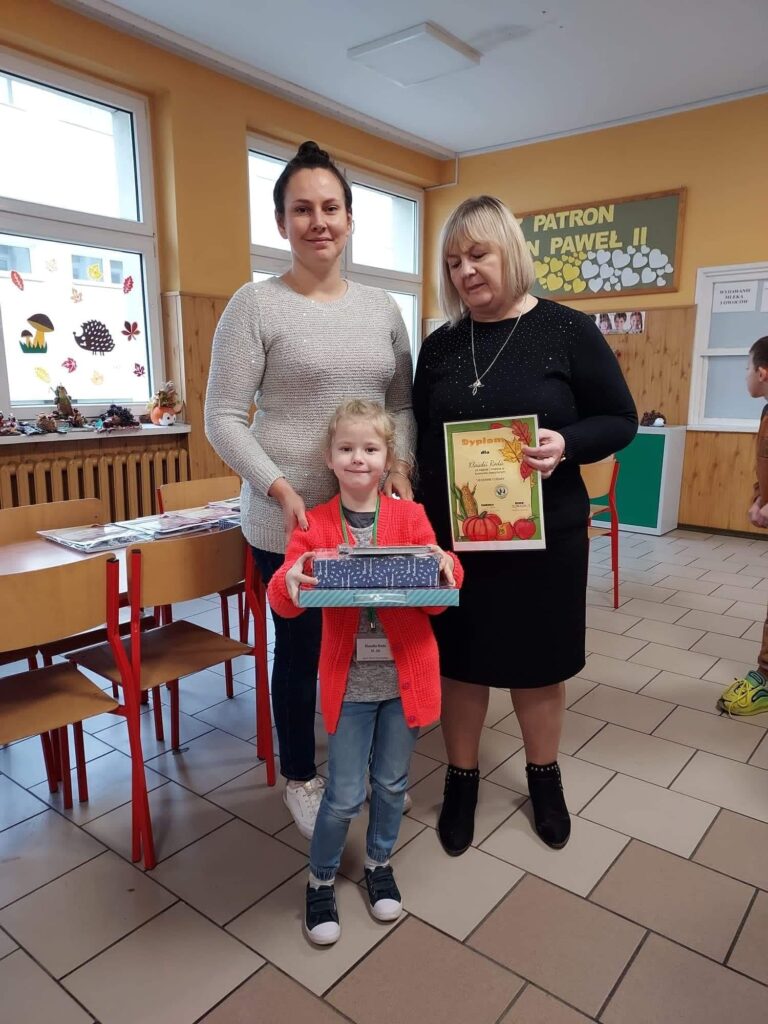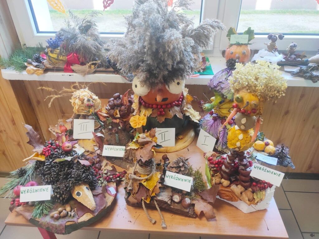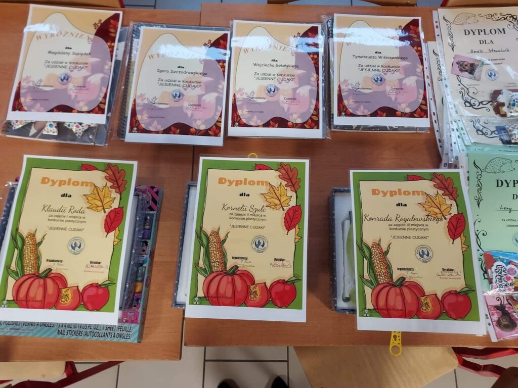 Wręczenie nagród w szkolnym konkursie „Jesienne cudaki”. Do świetlicy wpłynęły 52 prace konkursowe. Wybór najlepszych prac nie był łatwy, ponieważ wszystkie pracy były oryginalne, pracochłonne i bardzo kreatywne. Komisja konkursowa nagrodziła następuje osoby:Miejsce I Klaudia Roda, klasa 1bMiejsce II Kornelia Szulc, klasa 4bMiejsce III Konrad Rogalewski, klasa 4bWyróżnienia:Magdalena Sąsiadek, klasa 8aTymoteusz Wiśniewski, klasa 1bWojciech Gołuński, klasa 3bIgor Szczodrowski, klasa 3cGratulujemy zwycięzcom i dziękujemy za udział wszystkim uczestnikom.