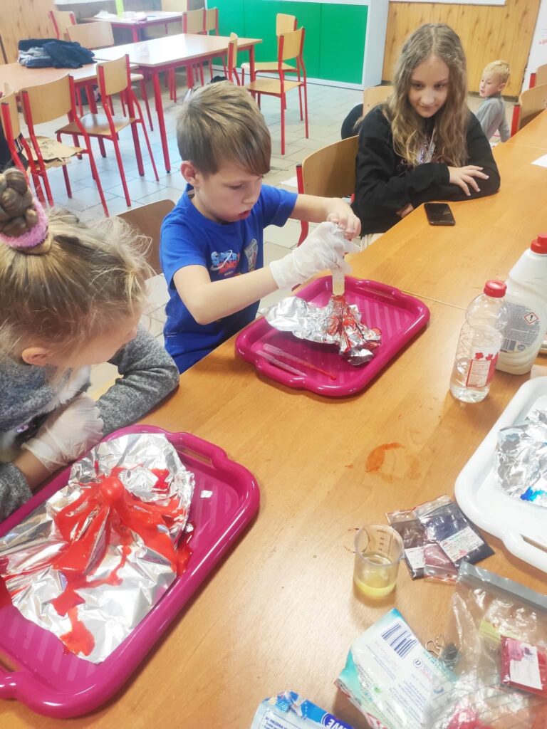 04 listopada w Świetlicy było naprawdę wybuchowo. Dzieci, pod czujnym okiem Pani Maji, wykonały kolorowe wulkany. Był to bardzo ciekawy sposób na odkrywanie właściwości podstawowych substancji chemicznych.